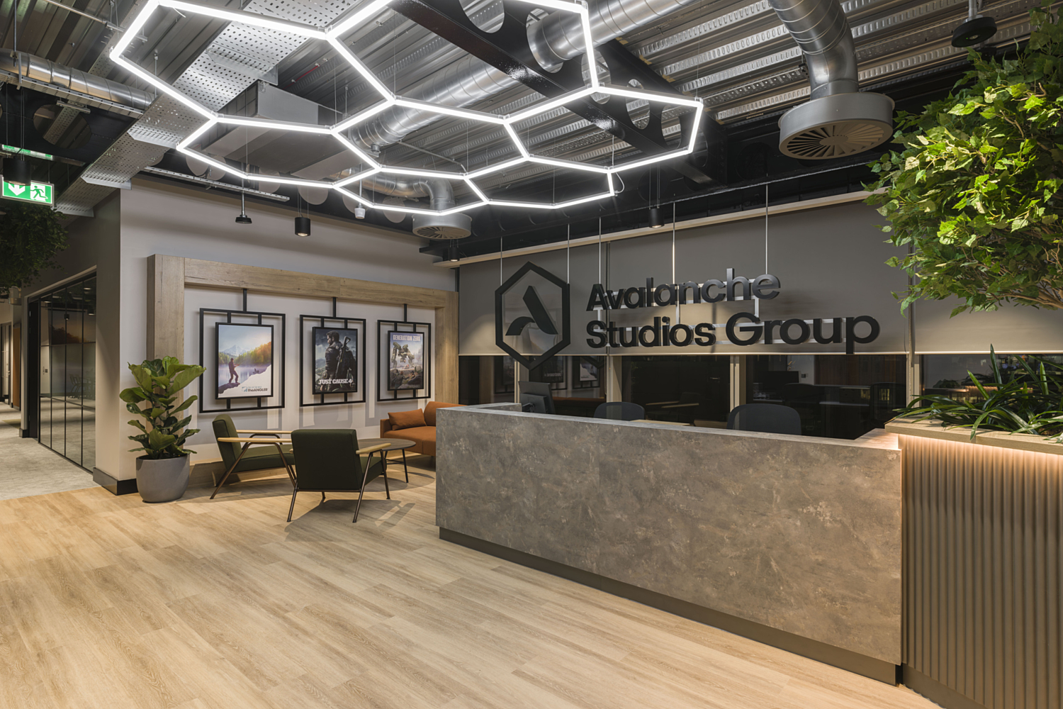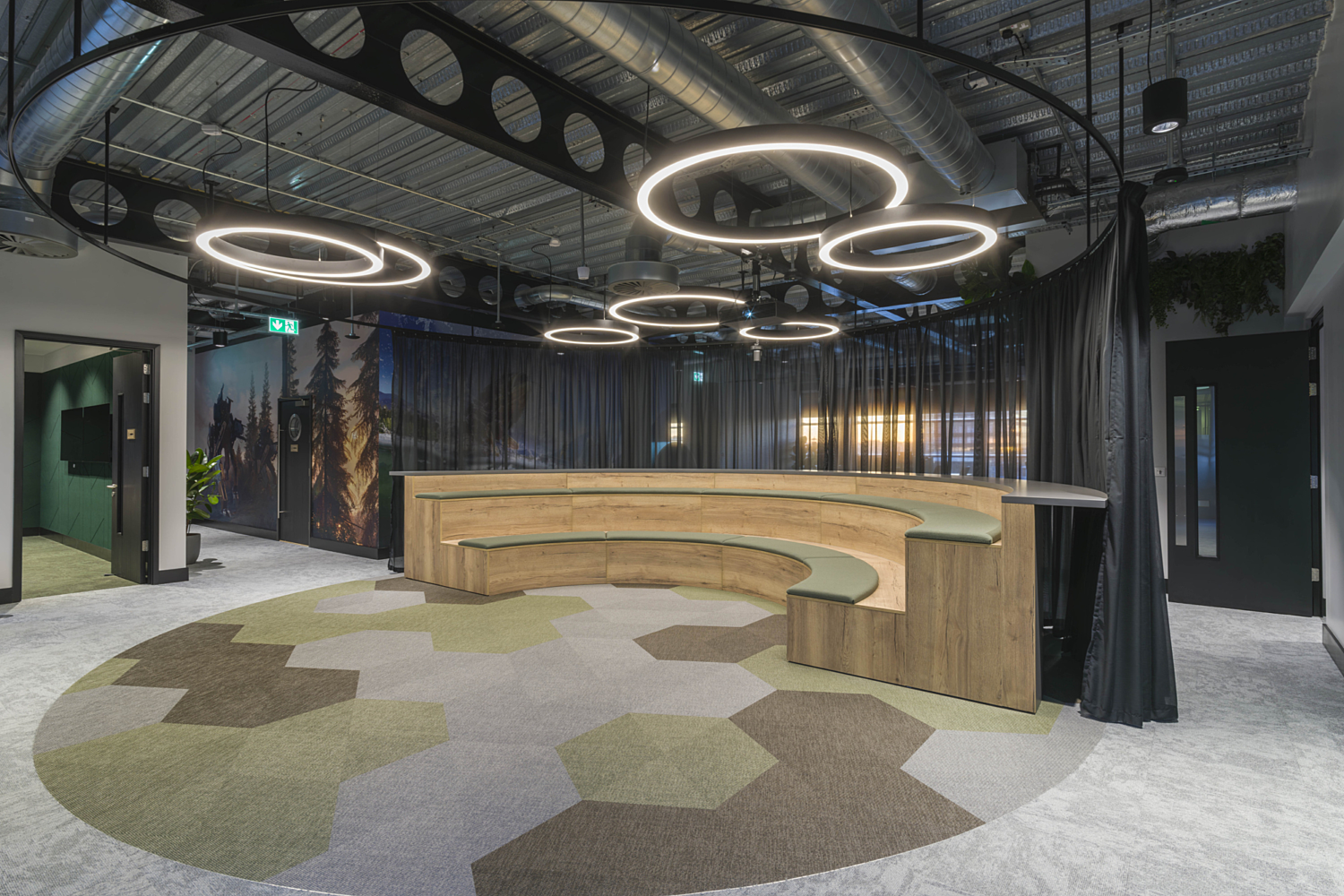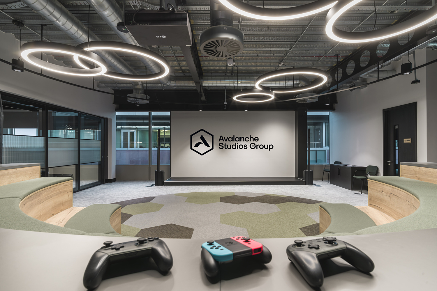 Taking its cue from nature, the design colour pallet softens the industrial elements whilst high resolution graphics punctuate the walls with concept art that reflects the pride in everything Avalanche do. This forms the backdrop for an office that caters to the diverse requirements of the team; taking into account the neurodivergent needs of a rapidly expanding, young workforce, ensuring inclusivity and comfort.