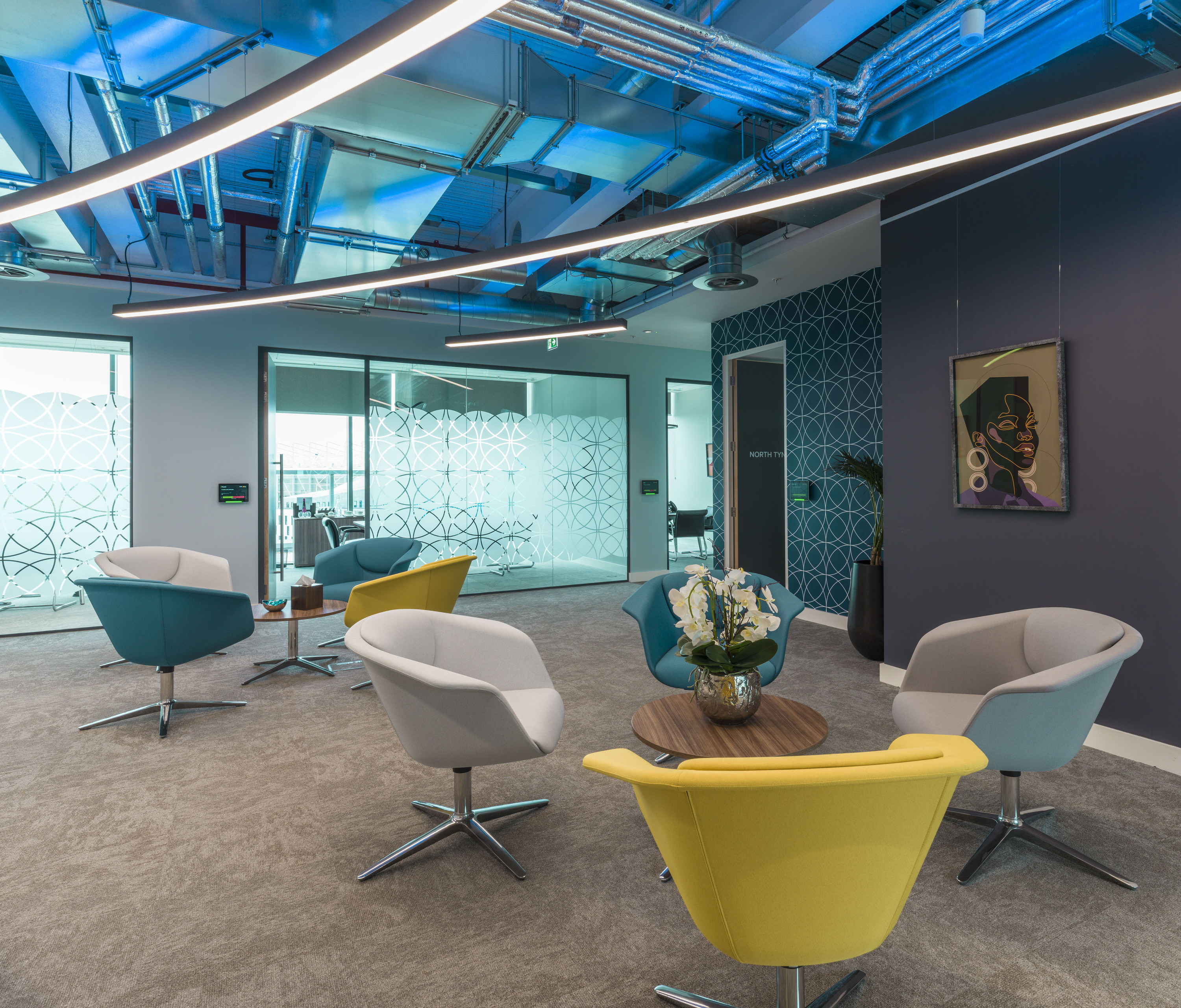 Knight Frank’s commitment to the circular economy was profound, and we couldn’t have been more on board. We helped Knight Frank to reuse and remanufacture a significant proportion of their furniture. This approach not only supported their green goals but also maximised their budget, allowing other areas of the fit out to benefit. The office design drew inspiration from Knight Frank's corporate colours, mixing vibrant regional graphics with calming muted tones to create a relaxed, eclectic atmosphere. This creative blend gave the space a unique and welcoming feel, making it both functional and inspiring for everyone.