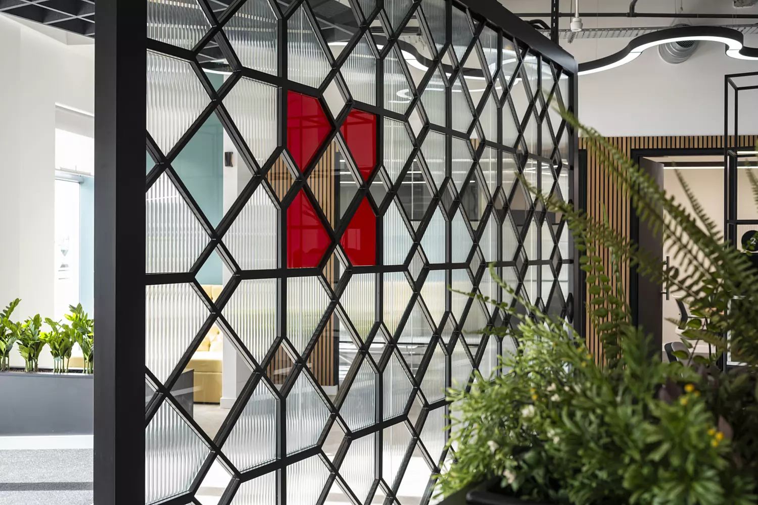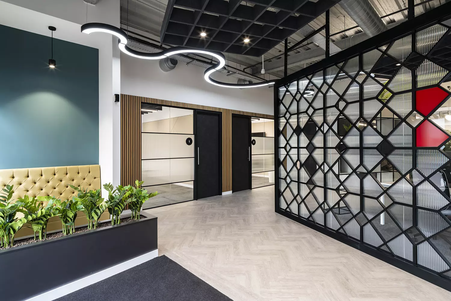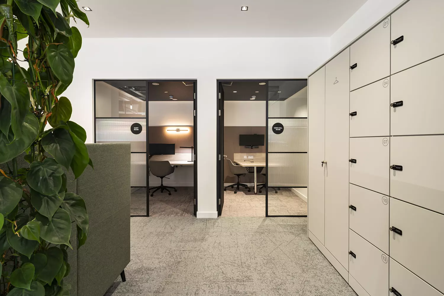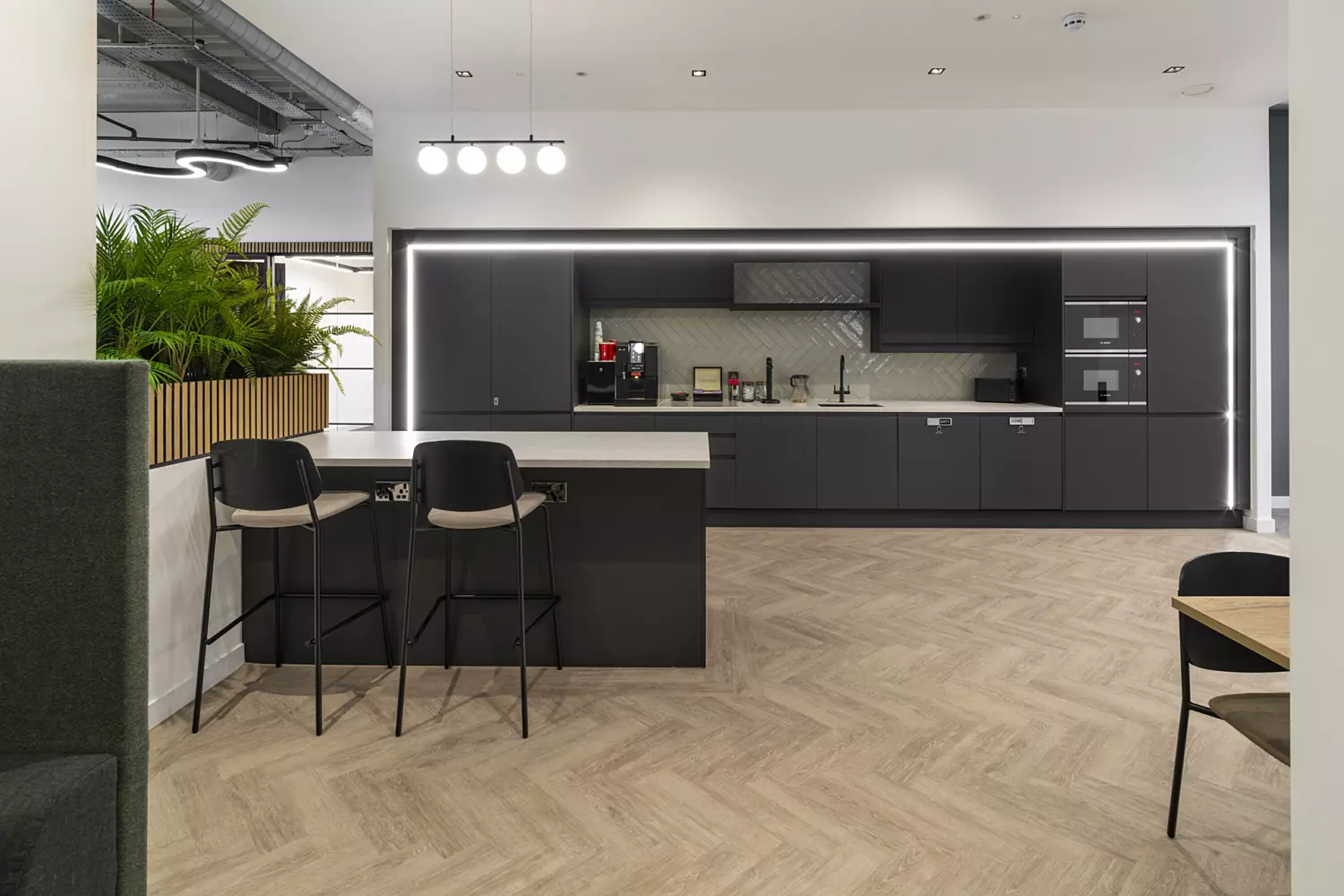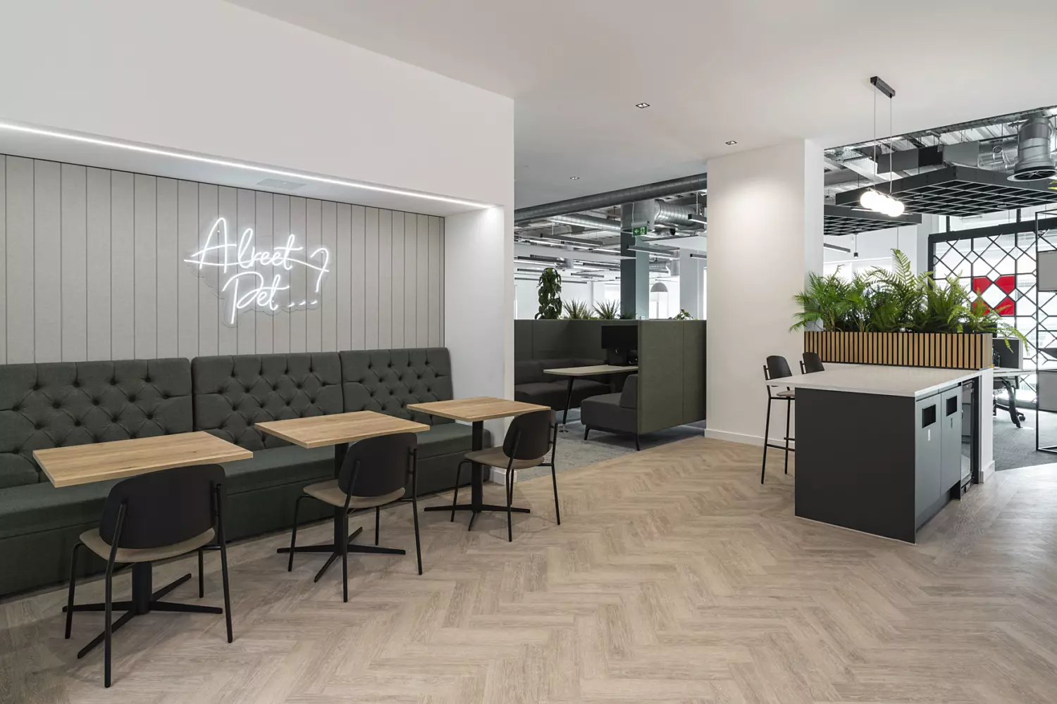 The open plan office was designed to include areas for individual, group and quiet work, supporting both collaboration and focused tasks. Statement screens and standout lighting add vibrancy and provide privacy where needed. Throughout the project, we made sure that the new office space was as functional as it was stylish, creating an environment that supports the varied work styles of Knight Frank's people.