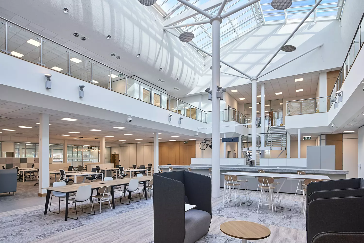 Everyone works differently, so we designed the new office to reflect the diversity of each department’s working styles. On the ground floor we created a large, open reception leading on to the central atrium furnished with long bench tables, hot-desking areas, conference rooms and a communal refreshment point. On the first floor, however, we set out to create more intimate working areas by installing smaller meeting rooms and focus pods. This diversity in workspace throughout the building allows staff to switch between spontaneous, free-flowing collaboration and more private, secluded modes of working.