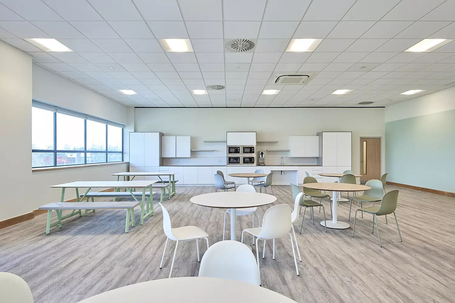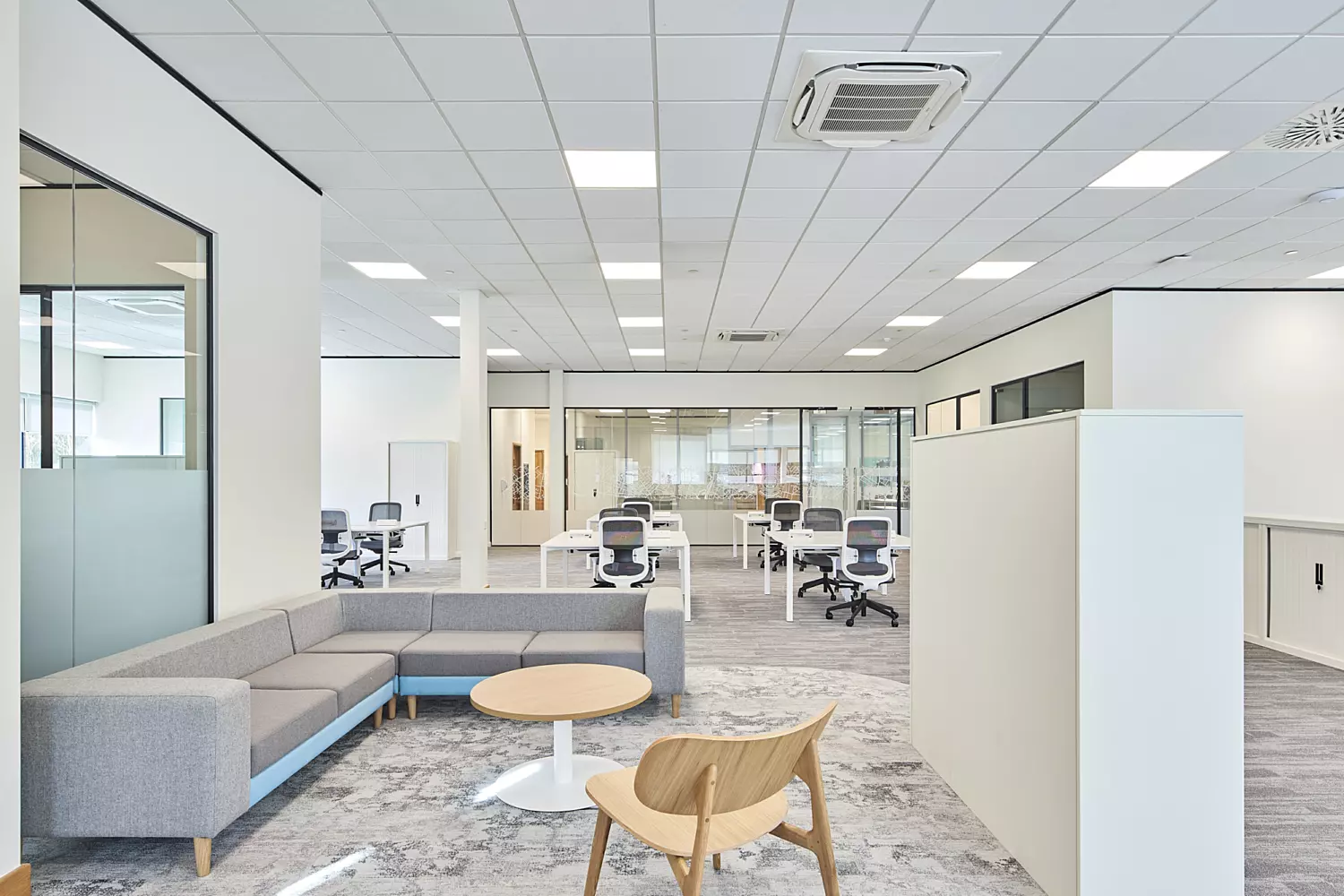All materials used in the project were specially selected with resilience and longevity in mind. It was crucial that the refurbished building could keep up with numerous members of staff and their ever-changing lives. We installed laminate flooring and worktops, durable furniture and hard-wearing upholstery which will comfortably accommodate years of use. Colours and textures were kept to a neutral design and palette to ensure that any damaged furnishings could be easily replaced, and that no one organisation's colours were prioritised, to provide an equal experience for all.