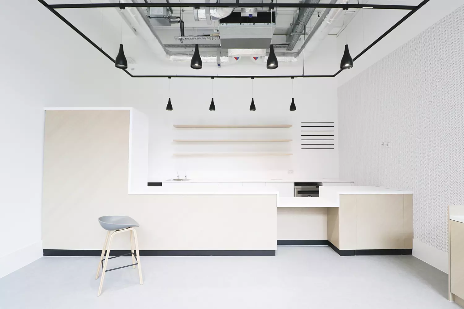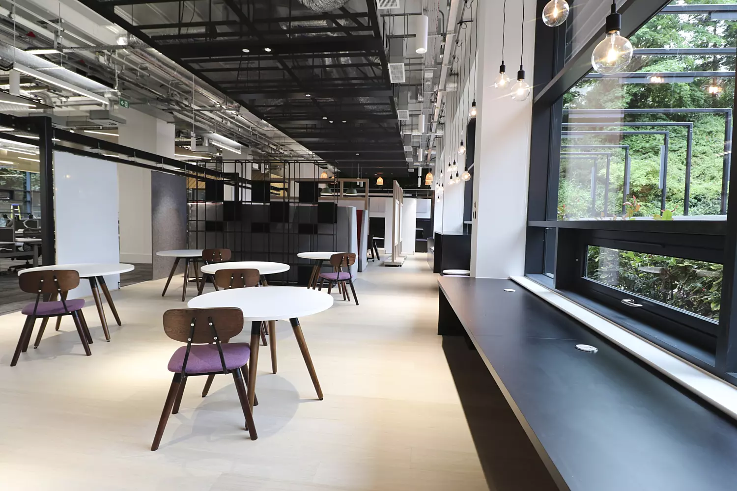 No modern office is complete without communal spaces for rest, reflection and relaxation. We replaced the tea point with a fully-equipped deli space with shelving, a food display area, an order-and-pay counter and recycling points. We also built a dining hall with cafe tables, booths and window benches.