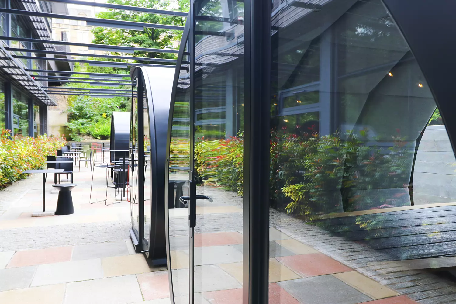 Outdoors, on the large terrace, we installed quirky weather-resistant enclosed benches. These large submarine-type pods have integrated heaters, data and power and are perfect for meetings and informal working all-year-round.