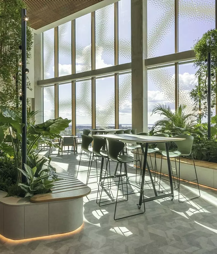 Exposure to natural light benefits employees both physically and mentally, however, it’s not always possible to provide everyone with a view. Previously, executive offices would enjoy the best locations in a building, yet office design trends are seeing more businesses putting communal spaces in these premium positions so that everyone can benefit.
